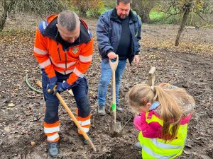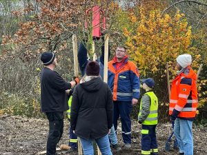 Die umfangreichen Vorarbeiten, darunter das Herrichten der Streuobstwiese sowie das Vorbuddeln der Pflanzlöcher, wurden im Vorfeld durch Mitarbeitende der Gemeinde übernommen. Diese sorgfältige Vorbereitung erleichterte den Beteiligten die eigentliche Pflanzaktion erheblich und trug entscheidend zum reibungslosen Ablauf bei